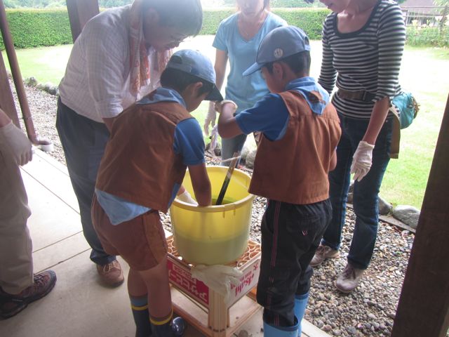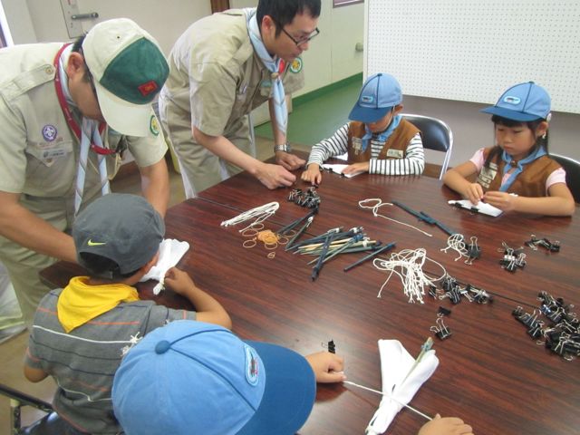 藍染めの先生にレクチャーをしてもらって、スカウト自らの手で木綿の白いハンカチを藍の染料で色付けしました。保護者の皆さんに助けてもらいながらの作業でしたが、色付け作業が終わって、次々に現れる藍色の鮮やかな幾何学模様にスカウトや保護者の皆さんから感動の声があがっていました。スカウトたちは自分だけの模様のハンカチの素晴らしい出来栄えに得意満面の笑顔でした。