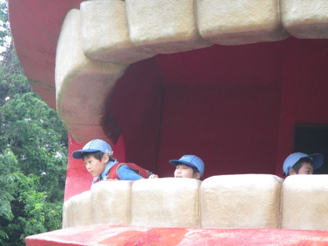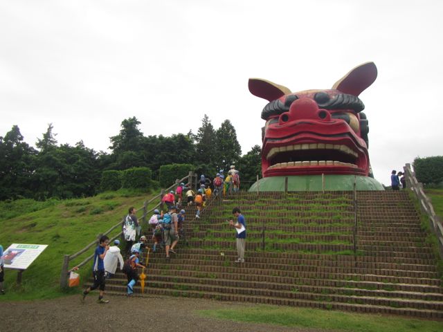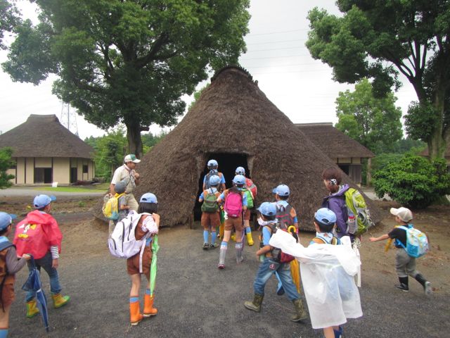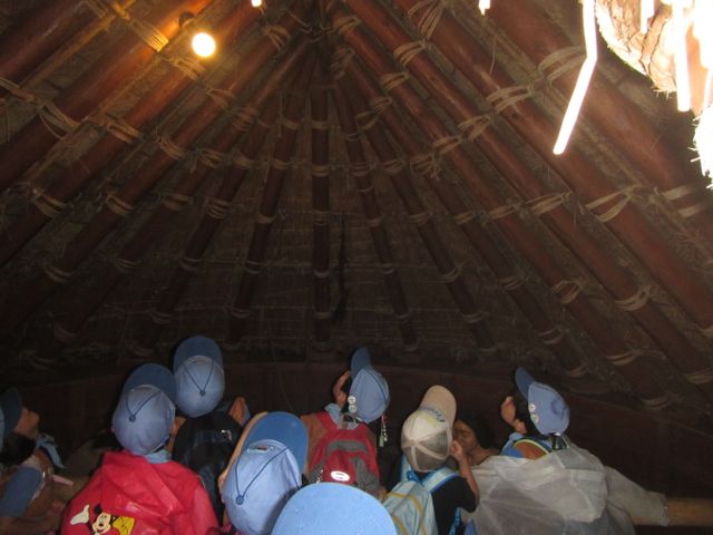 昼食後は隊長と一緒に小雨がパラつく園内を探検しました。いろいろな古代民家を訪ねてむかしの人たちの住まいや生活道具を体験し、最後は巨大な獅子頭展望台にのぼって遊びました。
