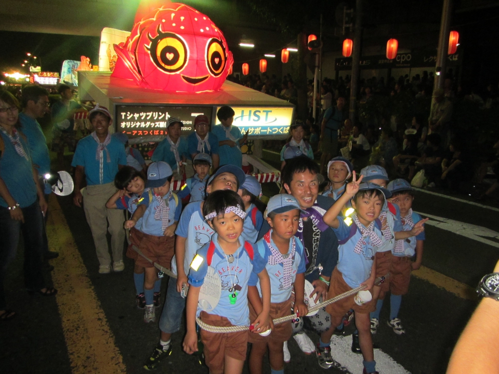 夏休み最後の隊集会は、今年も「まつりつくば」に参加しました。ビーバー隊は、かわいい金魚のねぶたを曳いて、