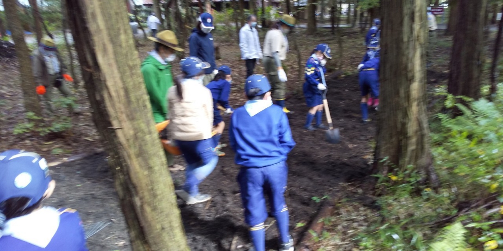 みんなで、感謝の心をもって一生懸命掃除をしました。これからもずっと、きれいな森で元気いっぱい活動できます様に!