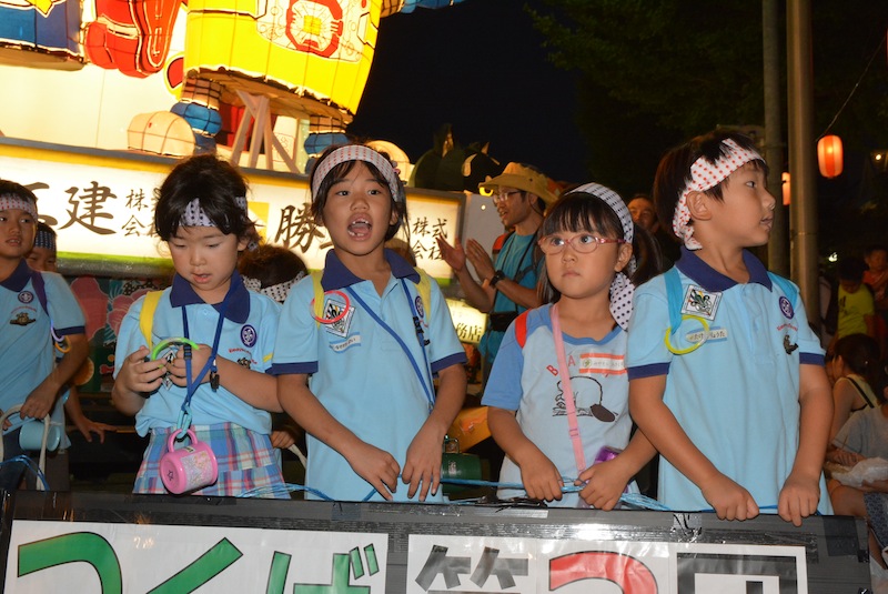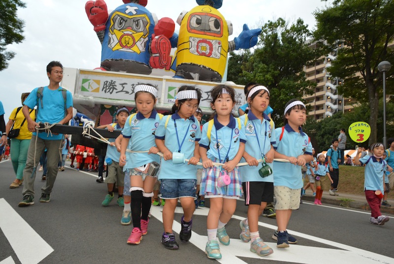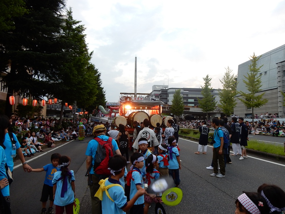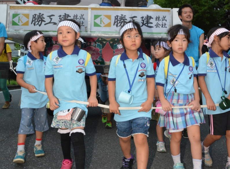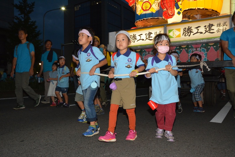 大勢のお客さんが見守る中、元気に山車をひっぱります!