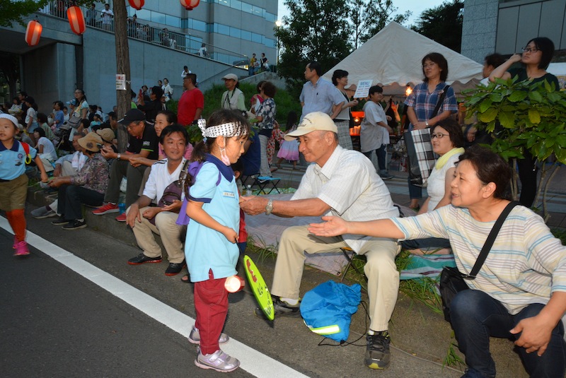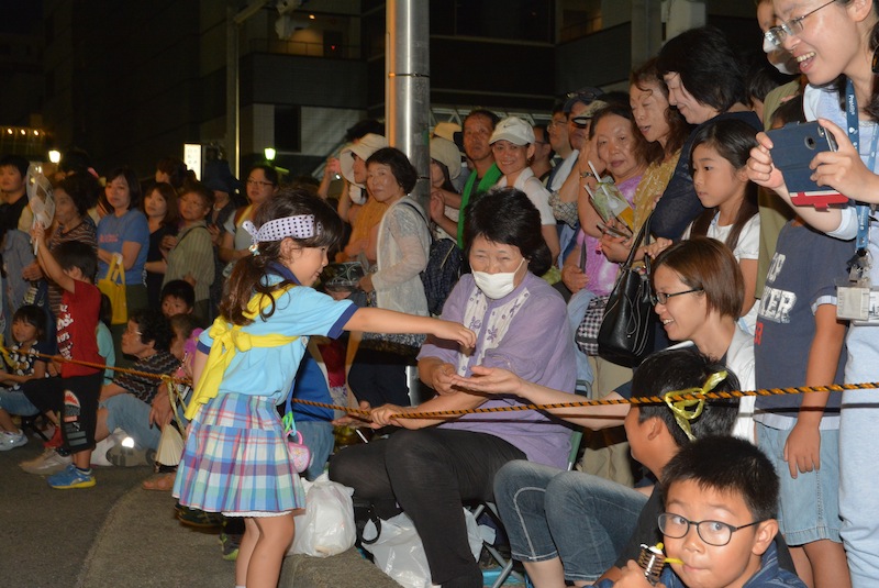 止まっている間、応援チームは沿道の方に幸せの鈴を配ります。