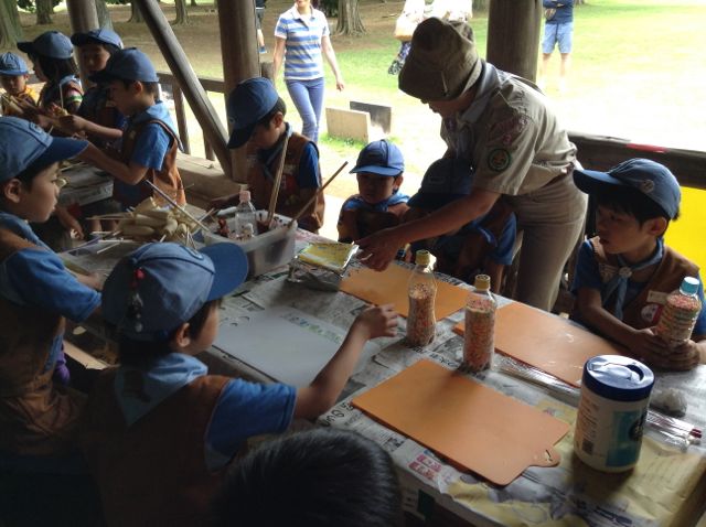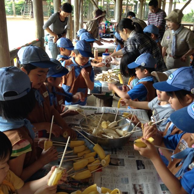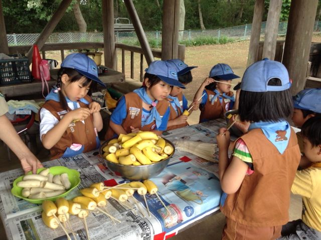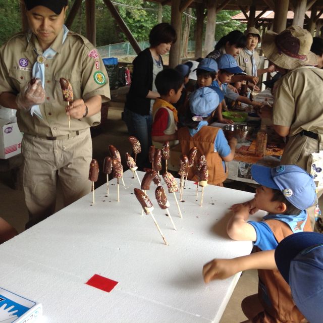 ビーバースカウトのチビっ子たちには、とても難易度の高い作業でしたがリーダーや保護者の皆さんのサポートの甲斐あって楽しみながら見事にステキな手作りチョコバナナ屋さんに仕上げました。開店後の模擬店ではビーバースカウト自ら呼び込みや接客をしてお店やさんごっこを楽しんでいました。