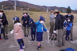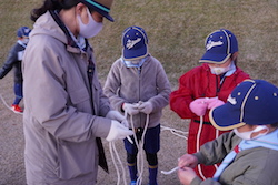 ロープを使った訓練では、「ロープ相撲」や、ロープ結び(8の字、はなむすび、もやい、ほんむすび、ひきとけ、一重つぎ、ふた結び)を練習しました。