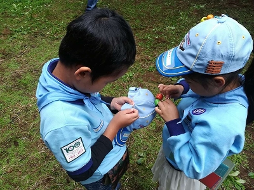 おまけ) 集会解散後に、今日はじめて隊長賞をもらった男の子に、帽子への付け方を教えてあげる女の子。
