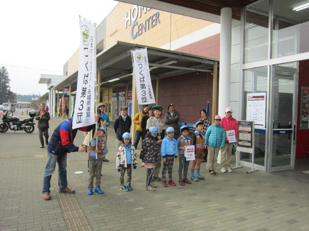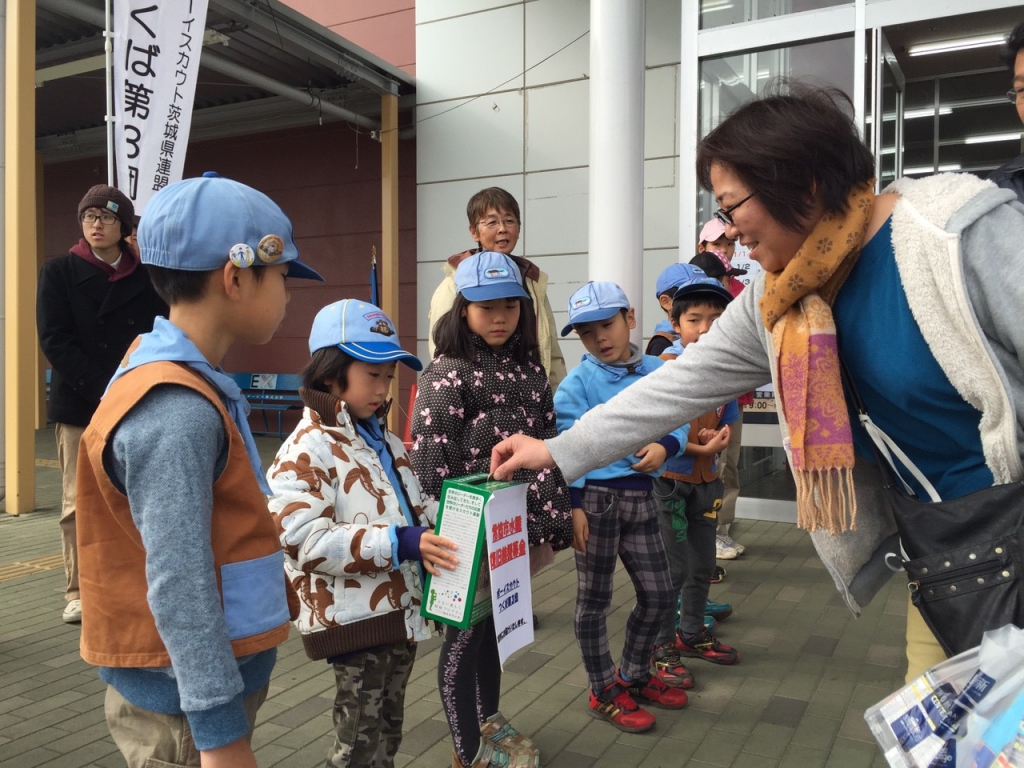 12月の1回目のビーバー隊活動は、グランステージ山新さんの店頭をお借りして、今年県内に大きな被害をもたらした、常総市鬼怒川水害の復旧義援金の募金活動を行いました。