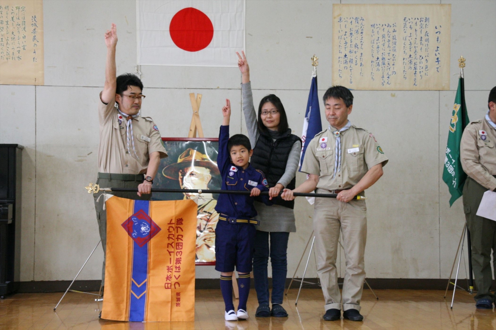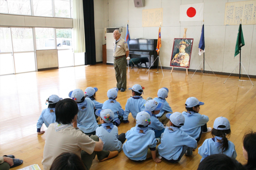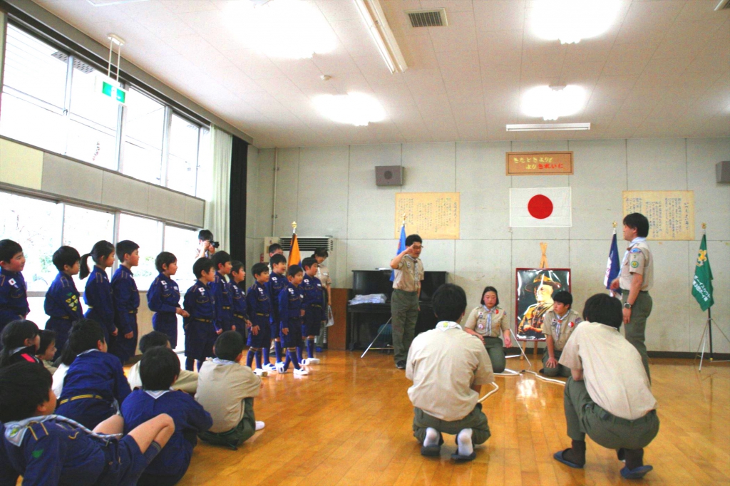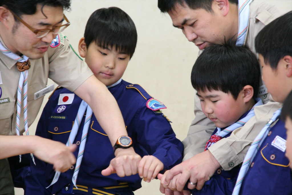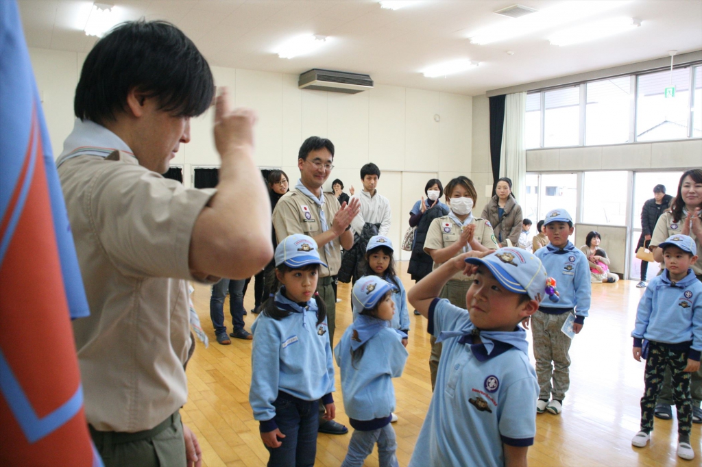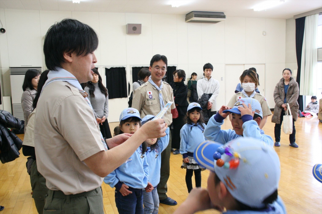 ビーバー隊の隊長から、カブ隊の隊長へ上進スカウトのお見送りです。