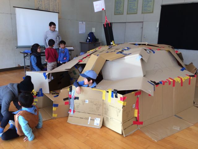 実際のプログラムでは、野生のビーバースカウトのダムのビデオを鑑賞したあと、ビーバー隊は2チームに分かれて、ダムづくりにチャレンジしました。 隊長が出した課題(入り口2つ、まど、部屋、旗)を取り入れた設計図を作って、廃ダンボールとテープを使って、みんなで仲良く組み立てていきました。