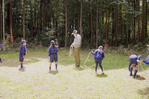 ロープを使った訓練では、「ロープ相撲」や、ロープ結び(8の字、はなむすび、もやい、ほんむすび、ひきとけ、一重つぎ、ふた結び)を練習しました。