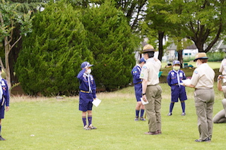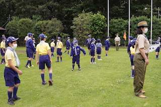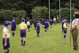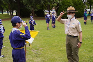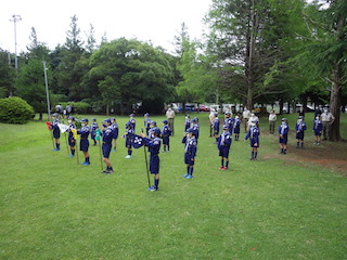 その後、スカウトたちが前後のソーシャルディスタンスをあけて並びます。